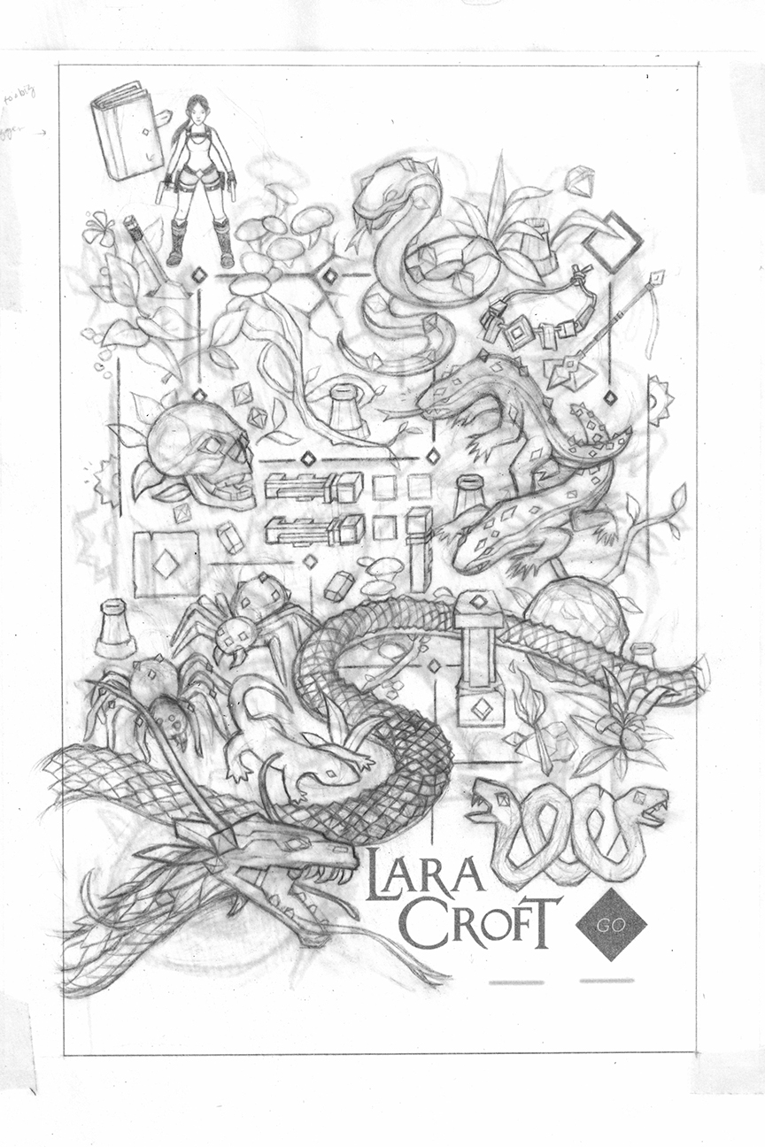 Sarah Gonzales, dibujante, ha compartido en su blog oficial el proceso de creación mediante bocetos del póster de Lara Croft GO. El objetivo era transmitir y fusionar el espíritu de la aventura y la nostalgia de los juegos clásicos con la mecánica del GO, basada en la superación de rompecabezas y puzles por turnos.