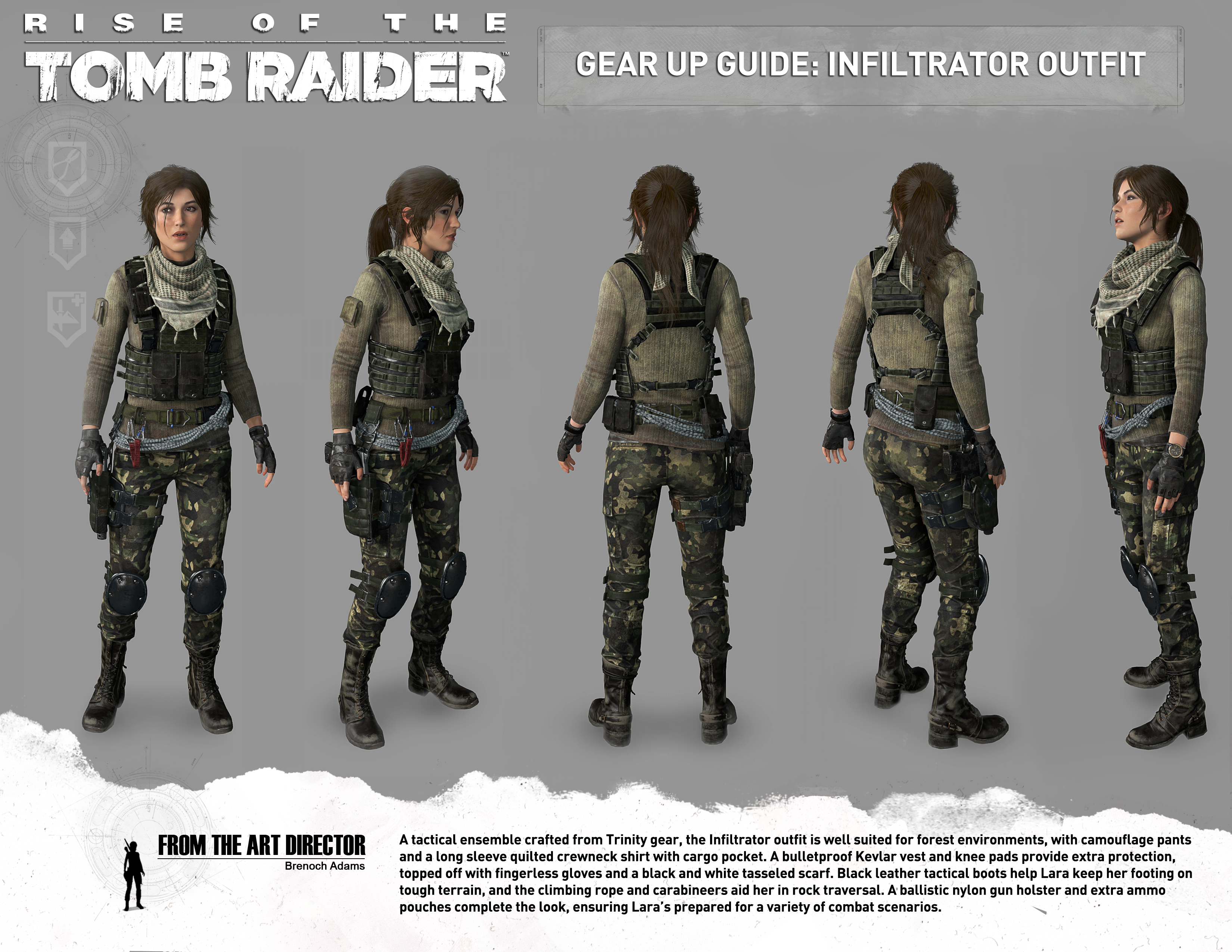«Un conjunto táctico hecho a mano del equipo de la Trinidad, el atuendo de infiltración es idóneo para entornos de bosque, con pantalones de camuflaje y una camiseta de manga larga de cuello redondo acolchado con bolsillos cargo. Una chaleco antibalas Kevlar y rodilleras proporcionan una protección adicional, con guantes sin dedos y un pañuelo de colores blanco y negro. Unas botas de cuero negras tácticas ayudan a que Lara mantenga su pie sobre terreno duro, y la cuerda de escalada y los mosquetones la ayudan en los saltos por las rocas. Una funda para el arma de nylon balístico y munición extra para completar el look, asegurando que Lara esté preparada para una variedad de escenarios de combate.»