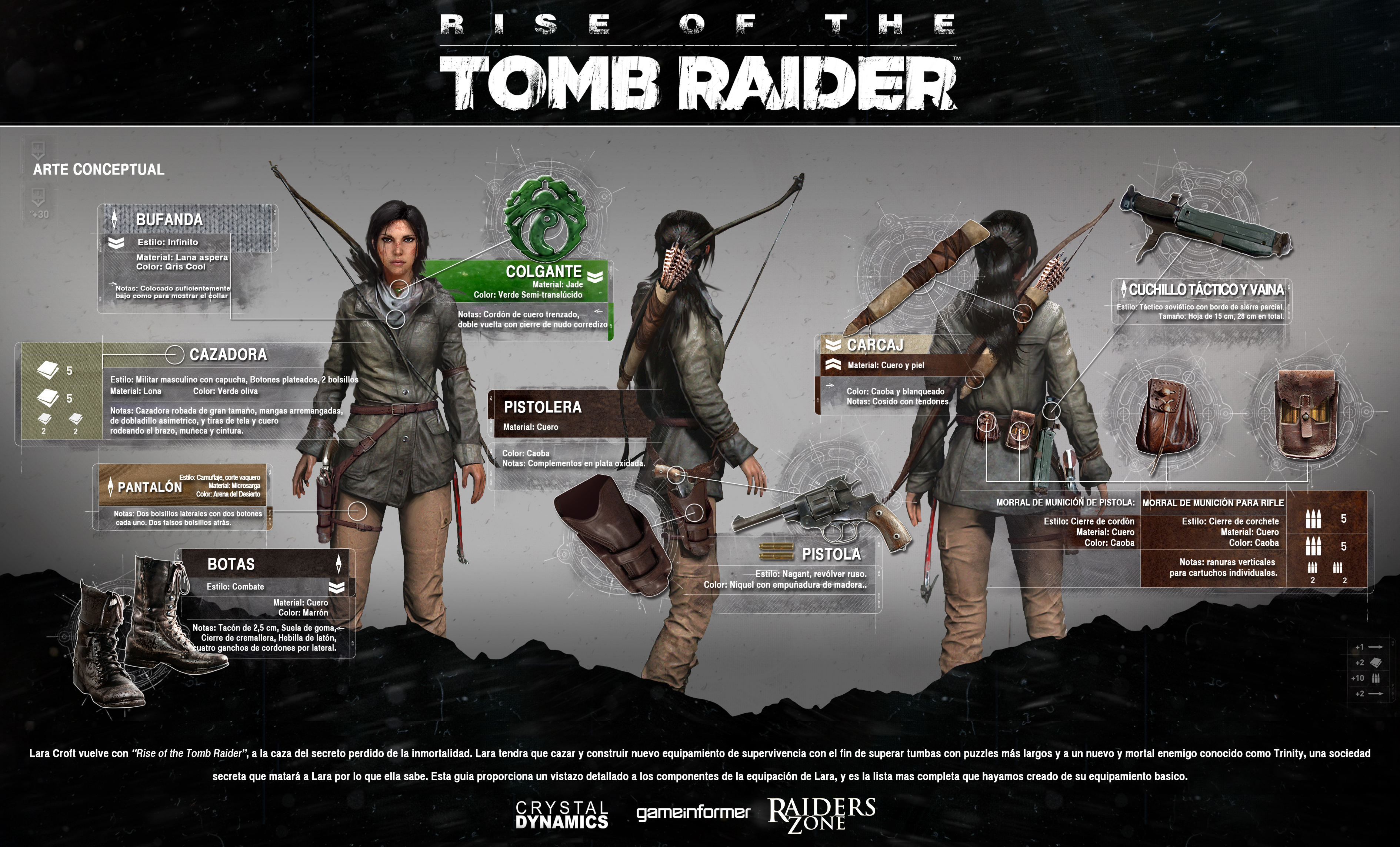 Game Informer ha lanzado una nueva actualización del HUB de Rise of the Tomb Raider. Hoy, una guía con el equipo que lucirá Lara en Rise of the Tomb Raider.