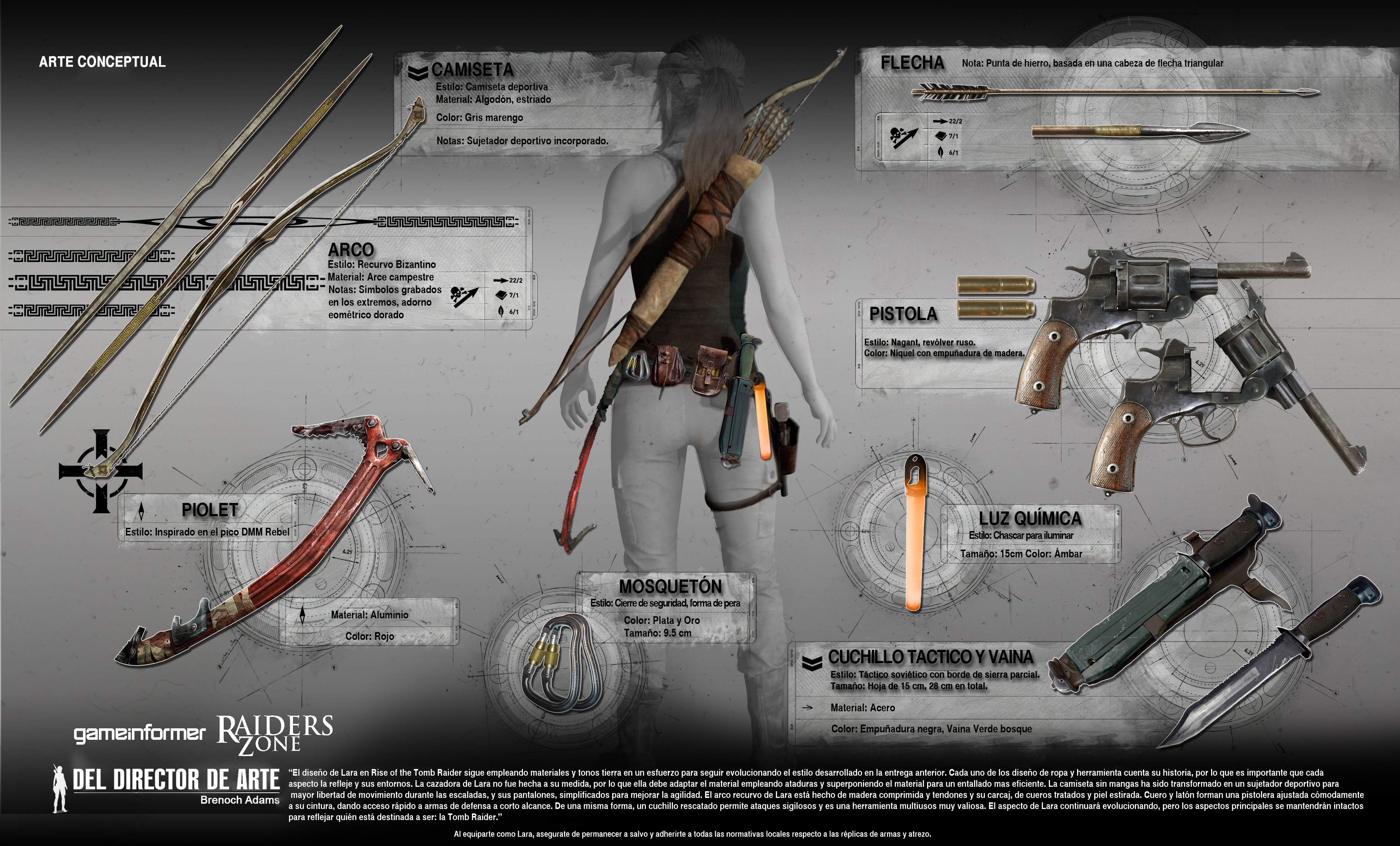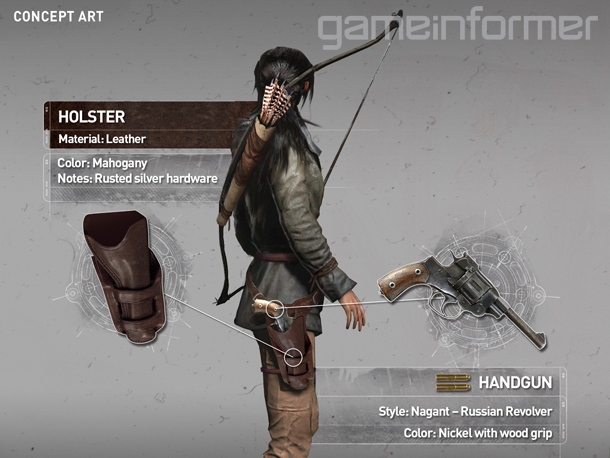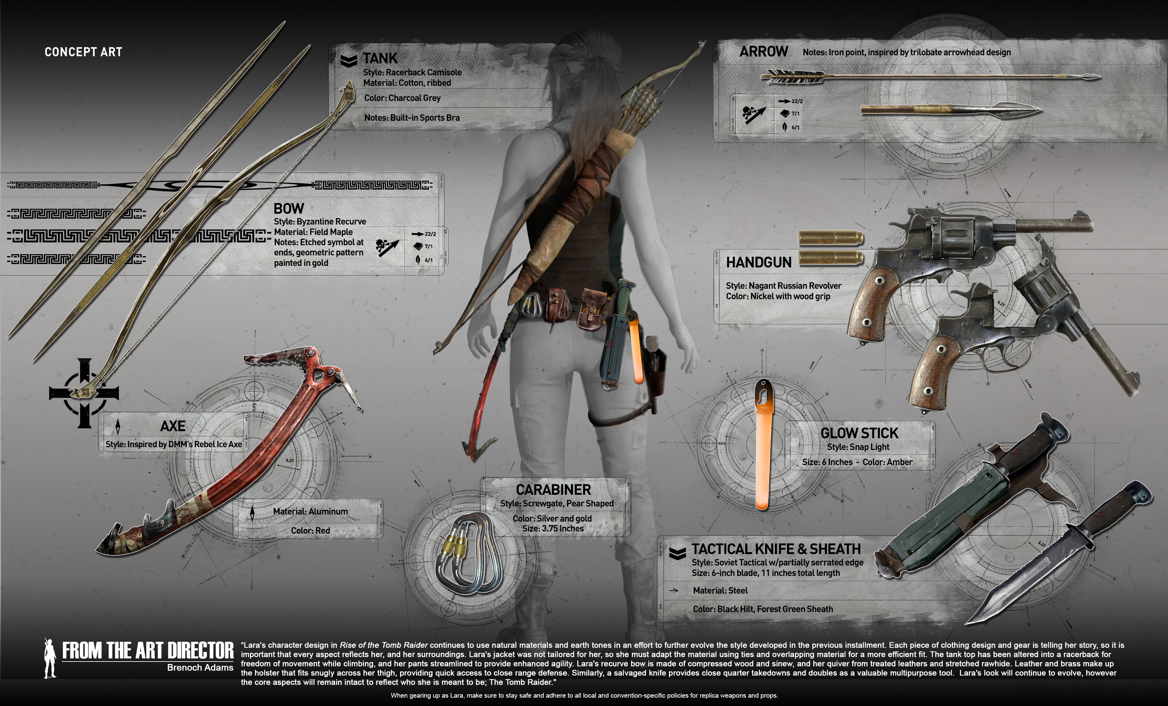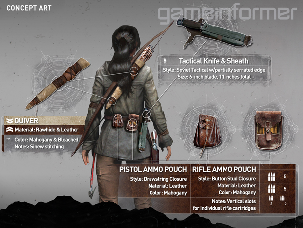 El diseño de Lara en Rise of the Tomb Raider sigue empleando materiales y tonos de tierra en un esfuerzo para seguir evolucionando el estilo desarrollado en la anterior entrega. Cada uno de los diseño de la ropa y las herramientas cuentan su historia, por lo que es importante que cada aspecto la refleje a ella y a sus entornos. La cazadora de Lara no fue hecha a su medida, por lo que ella debe adaptar el material empleando ataduras y superponiendo el material para un entallado más eficiente. La camiseta sin mangas ha sido transformada en un sujetador deportivo para mayor libertad de movimiento durante las escaladas, y sus pantalones, simplificados para mejorar la agilidad. El arco recorvado de Lara está hecho de madera comprimida y tendones, y su carcaj, de cueros tratados y piel estirada. La combinación entre el cuero y el latón forman una pistolera ajustada cómodamente a su cintura, dando acceso rápido a armas de defensa a corto alcance. De la misma forma, un cuchillo recatado permite realizar ataques sigilosos y, además, es una herramienta multiusos muy valiosa. El aspecto de Lara continuará evolucionando, pero los aspectos principales se mantendrán intactos para reflejar quién está destinada a ser: la Tomb Raider.