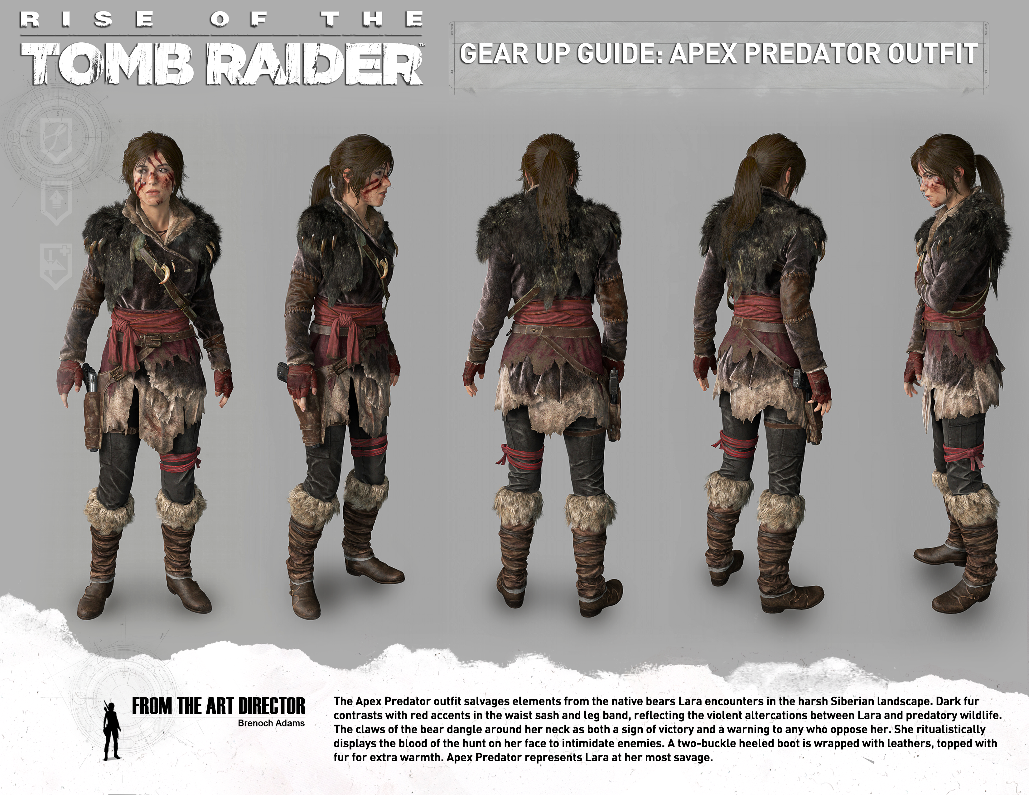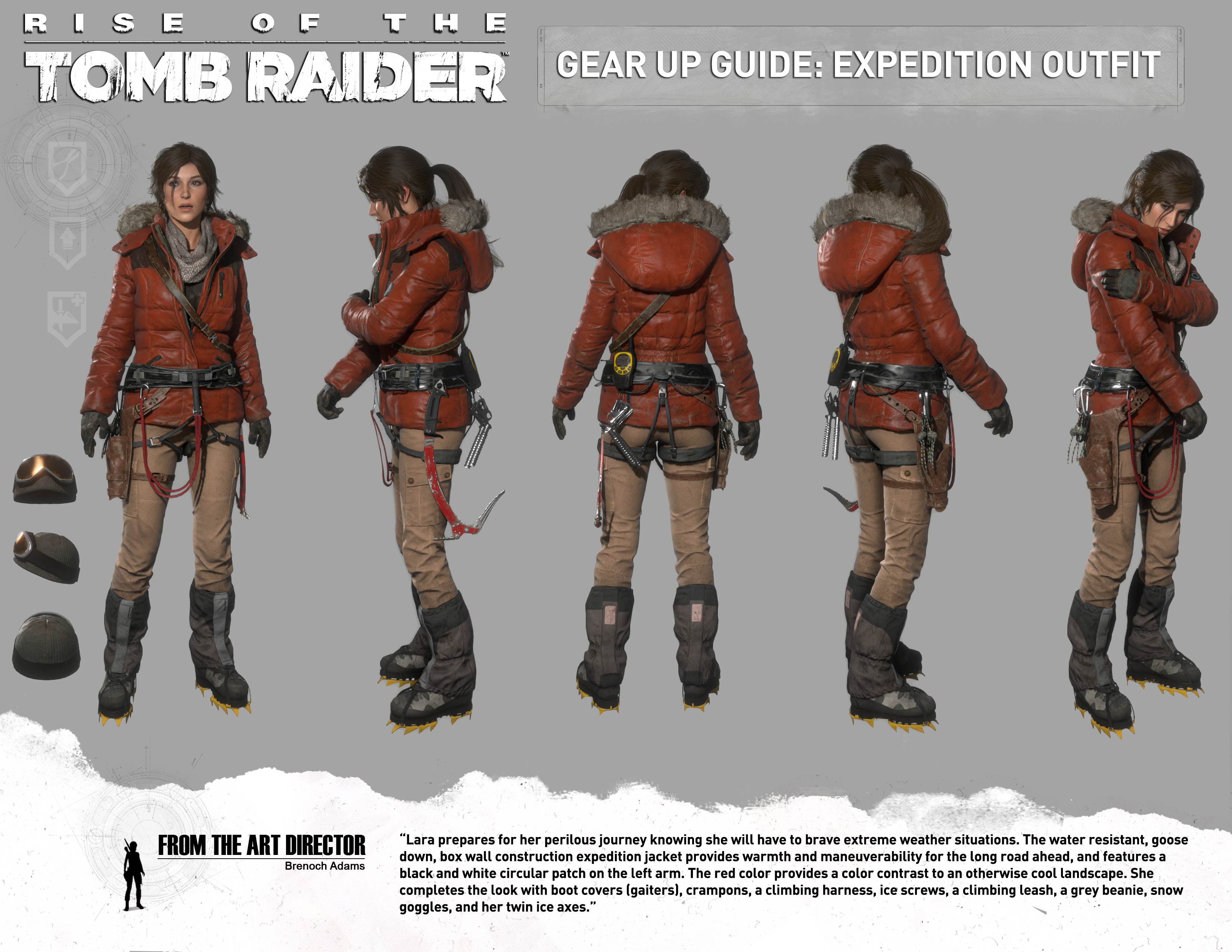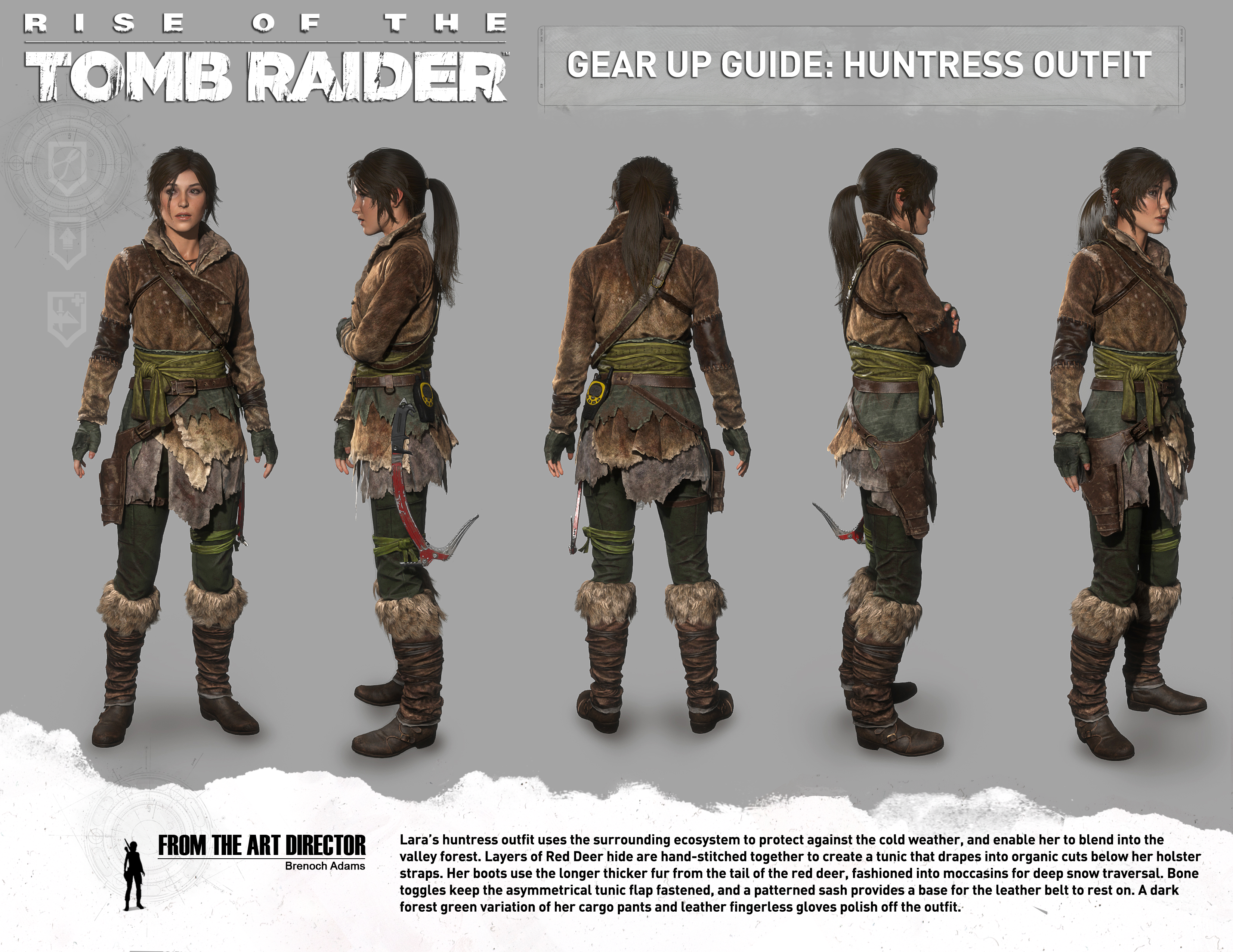 «Un conjunto táctico hecho a mano del equipo de la Trinidad, el atuendo de infiltración es idóneo para entornos de bosque, con pantalones de camuflaje y una camiseta de manga larga de cuello redondo acolchado con bolsillos cargo. Una chaleco antibalas Kevlar y rodilleras proporcionan una protección adicional, con guantes sin dedos y un pañuelo de colores blanco y negro. Unas botas de cuero negras tácticas ayudan a que Lara mantenga su pie sobre terreno duro, y la cuerda de escalada y los mosquetones la ayudan en los saltos por las rocas. Una funda para el arma de nylon balístico y munición extra para completar el look, asegurando que Lara esté preparada para una variedad de escenarios de combate.»